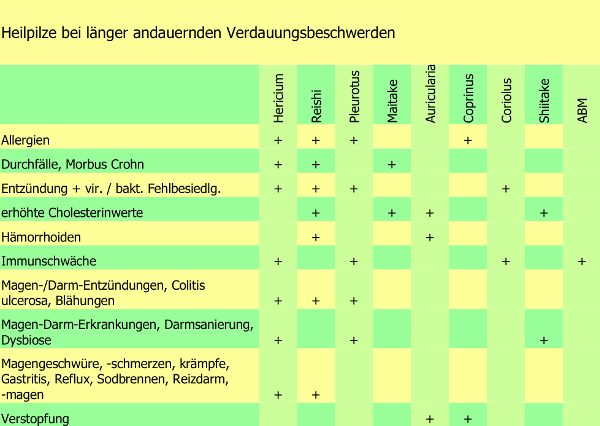 Für die Darmgesundheit werden auch oft die Pilze Pleurotus ostreatus (Austernpilz), Coprinus comatus (Schopftintling), Coriolus versicolor (die Schmetterlingstramete) und Shiitake verwendet. Siehe Tabelle.